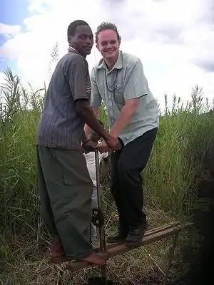 A treadle pump is a human-powered Pump designed to lift water from a depth of seven meters or less. A treadle is a lever device pressed by the foot to drive a machine, in this case a pump. The treadle pump can do most of the work of a motorized pump, but costs considerably less (75%) to purchase. Because it needs no fossil fuel (it is driven by the operator's body weight and leg muscles, it can also cost less (50%) to operate than a motorized pump. It can lift five to seven cubic meters of water per hour from wells and boreholes up to seven meters deep and can also be used to draw water from water sources such as lakes and rivers. Many treadle pumps are manufactured locally, but they can be challenging to produce consistently without highly skilled welders and production hardware.