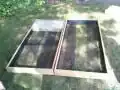 The frame that supports the nutrient reservoirs and growth medium are essentially two bookshelves constructed with 1x4in pieces of wood. The dimensions of the box frames are 4ft in height and 2ft in length. As shown in Figure 3, the frames are connected by hinges that allow the unit to fold into itself, providing an easier means of transporting or shipping the model. All wood used in construction is first finished with shellac and later lined with plastic to prevent wood rot from constant exposure to moisture; also displayed in Figure 4.