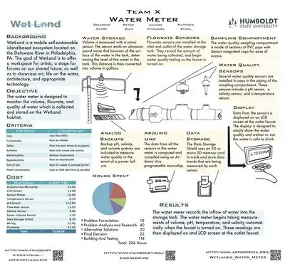The water meter, designed by Team X, tests the water quality for the WetLand project. The design is composed of five sensors that read the volume, pH, salt water content via conductivity, temperature (Fahrenheit), and the flow of the water into the water tank of the drinking water on the barge. All of the values the sensors take are read by an Arduino programmable microchip and displayed on a liquid crystal display (LCD) screen. While displaying these values it will be saving those values to an SD card that is incorporated into the Arduino microchip.