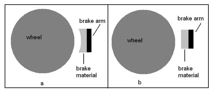 The material used to inhibit motion of the wheel, that is the brake material, must have a high coefficient of friction when in contact with the wheel, be resistant to wear and environmental effects.[10] Rubber, old tires, brake pads from old cars or bicycles or a dense, rough plastic material are all appropriate materials for this application. When attaching the material to the arm, a point to consider is the shape of the material. Figure 6 below shows two options with diagram a showing the more preferable shape.
