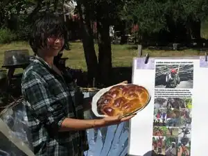 The Willow basket parabolic solar cooker was created by Elizabeth Titus, Elle Parks, Simon Walter-Hansen and Bart Orlando for the Lost Valley Education and Event Center. Above - Kim Goulet displays Challah Bread she prepared and baked using the Willow Basket Solar Oven at the Lost Valley Education and Event Center in August of 2016.