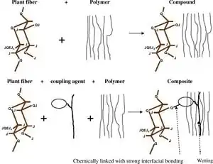 A second limitation in the compounding process is the lack of dispersion between the wood fibers and the thermoplastic matrix. To improve this limitation, a coupling should be introduced in the mixing process to help facilitate the bonding between the wood and thermoplastic. The introduction of a coupling agent, seen in Figure 6, can have a large impact on the tensile strength of a WPC. An experiment, done by Andrea Wechslera and Salim Hiziroglu, showed that when a coupling agent was added in the compounding process the tensile strength of the final product could increase from 2109MPa to 3560MPa, or by 68%.[12]