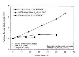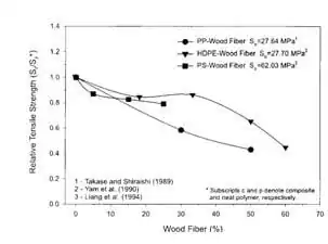 The first step in wood-plastic composite fabrication, called compounding, blends organic plant fibers with an inorganic thermoplastic. The percent of wood fiber used in this processing step is very important as it directly affects the tensile strength and Young's modulus of the product produced. Graph 1 and Graph 2 show how the relative tensile strength and relative tensile modulus of the WPC produced changes when the amount of wood fiber is varied, respectively.