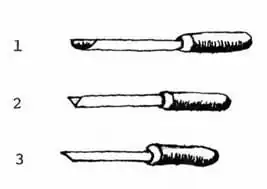 Showing the three basic tools used in wood carving: 1. gouge, 2. vaining, 3. sque.