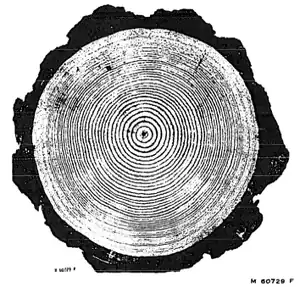 With most species in temperate climates, there is sufficient difference between the wood formed early and that formed late in a growing season to produce well-marked annual growth rings. The age of a tree at the stump or the age at any cross section of the trunk may be determined by counting these rings (fig. 2-2). If the growth of trees in diameter is interrupted by drought or defoliation by insects, more than one ring may be formed in the same sea- son. In such an event, the inner rings usually do not have sharply defined boundaries and are termed false rings. Trees that have only very small crowns or that have accident- ally lost most of their foliage may form only an incomplete growth layer, sometimes called a discontinuous ring, until the crown is restored.