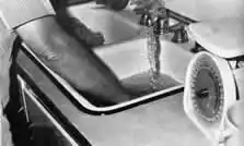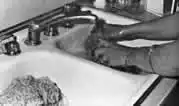 Above: Wool should be washed carefully and thoroughly to remove all the lanolin and dirt before dyeing. This foreign matter will keep wool from dyeing evenly. Below: Rinse wool through several waters.