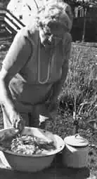 In the next pages you will discover the process of dyeing, how to do it, what colors you can expect from certain mordents and plants and how dyeing can be a worthwhile pastime. Elizabeth Fishwick hangs the last skein of wool in the sun to dry at the end of a long day's work dyeing with natural dye materials. Here she is pinning up wool dyed with marigold flowers.