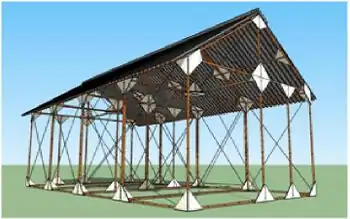 The Just Add Sticks or JAS shelter is a low cost transitional shelter for natural disaster survivors[1]. The JAS shelter is constructed with available dimension cut "sticks" which are then tied together with corrugated polypropylene connections and zip-ties to form the basic structure. In the case of the Haiti relief effort the "sticks" being used in construction are harvested bamboo originating from South America[1]. The JAS shelter is a modular design, and sections can be added in repeating units to accommodate larger numbers of people. Enclosing an 18m2 area, a single JAS shelter can provide protection from the elements for five people[1].