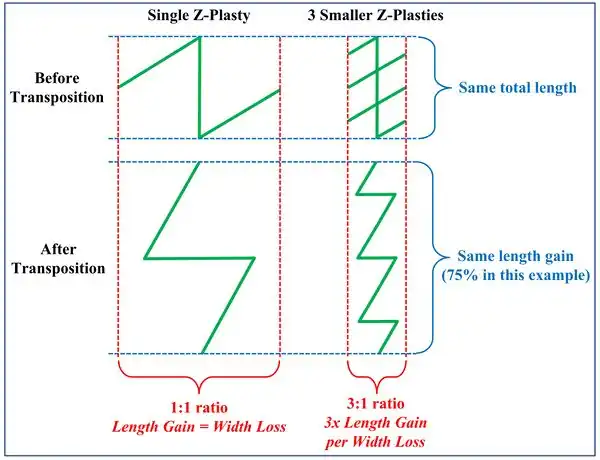 In areas that are cosmetically sensitive or have limited adjacent tissue for recruitment - like the face or hand - a single large z-plasty can be replaced by a stack of multiple smaller z-plasties. This allows for the same degree of total lengthening but with less narrowing, and therefore less distortion to surrounding tissues.