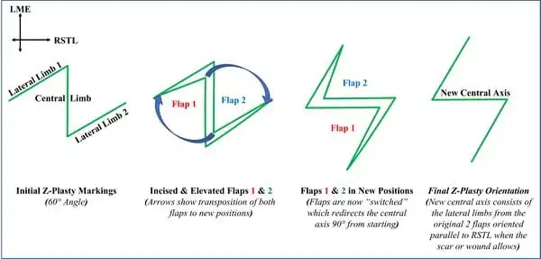 Z-plasty is named for its resemblance to the English letter “Z”. It is formed by a central limb and two lateral limbs, resulting in two equal and opposing triangular flaps. When the flaps are transposed, the central limb is reoriented and lengthening is achieved.