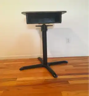 Our first step was to create a base that could hold the weight of the table-top itself and be able to adjust freely and easily. These parts were acquired from the Arcata Scrap Yard. The next step was to acquire a tabletop that could mount to the current base and spin freely as well as allowing for enough space for group work. These steps required multiple hours of collaboration and deliberation to come to a consensus of the type of base that would work best with the shape of the table top used. With this product, students now have the opportunity to stand up from their normal and work at the standing desk to give to give them a chance to stand and stretch out during these prolonged periods of time where they usually sit.
