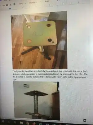 Use gallery for descriptions of photos. Our final project is an adjustable desk that goes from 29 to 48 inches high. This size difference allows students of all different heights to be able to use it. By spinning the top of the desk to the right it will lower the size of it and when you spin it to the left it will make the desk be taller. The base of the desk is a four-legged base because it gives it the best stability so it is not unbalanced in any way. The spinning mechanism allows the desk to be raised and lowered with only one person doing it instead of having to have anyone else help them. The table top is the size of an average desk's top which gives the student a good amount of room to work and there is a little pencil indentation on the desk so they will not have to worry about their pencil falling off of the desk. Also, underneath the desk will have a little shelf area where they can store paper, folders, textbook, etc.