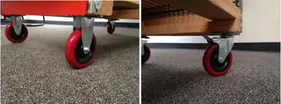 Wheels The wheels are five inch polyurethane casters. The front two are swivel and the back are non-swivel. This allows easy turning and stable steering when needed. The polyurethane material they are made out of will prevent the noise our client currently has an issue with. Figure 6 shows the difference between swivel and fixed casters.