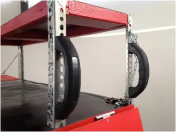 Extendable Shelves The extendable shelves are constructed of a thin sheet of plywood attached using a double sided hook and U-Bolt with a non-locking hinge to the bottom shelf and a hanging chain connected to the top shelf; this will be detached during transit. Figure 4 below shows the extendable shelf mechanism.