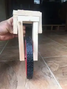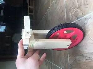 | A prototype of a locking caster was made to help understand how effective a set of moving arms that rotated downward would be in locking the caster in only one direction. The top image show the caster without the locking arm implemented, this allowed the wheel to rotate freely. The top horizontal arms is what moves downward and locks the spinning wheel in a single direction. This is shown in the image on the bottom.