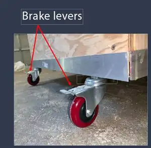 Pressing down on the two (non-colored) levers attached to the front wheels of the cart will prevent the wheels from moving and keep the system stationary. The brakes can be retracted by moving the brake levers upwards.