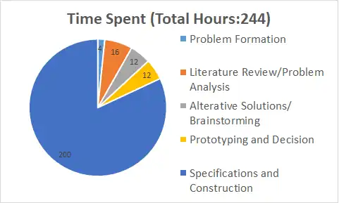 The diagram bellow demonstrates the cost in hours for team TBD. Between the four group members a total of 244 hours was spent on this project. The sections of the diagram represents a specific phase of design process.