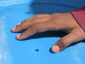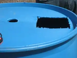Cut hole in "bottom" of drum that will fit the PVC pipe that will be used for each goal. This is the left hole shown in the picture below. Also cut a hole big enough to fit your hand into. This hole is shown on the right in the picture to the left.