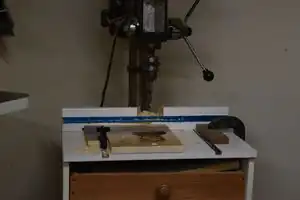 Use drill press to create appropriately sized holes for the two wooden dowels and magnets.