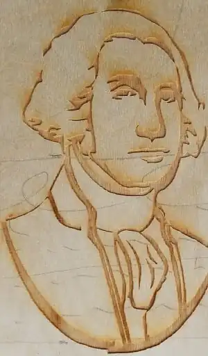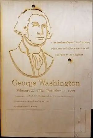 The Inspirational wall mounted headphone rack, shown in Figure 1, is a headphone rack that not only serves the purpose of a headphone rack but it also is a source of inspiration to students. It consists of a pre laminated plywood backboard. On the surface of the board there is a laser engraved historical figure that pertains to what the teacher is teaching when the room is used for the social studies part of the class. Below the figure is their name followed by the dates showing their lifespan, and a few bullet points describing important parts of the figures life and the reasons why they are remembered. Above the figures head is a 3/4" dowel that is imbedded in the board and secure with strong wood glue so it can not be removed. this dowel is used to hold the headphones above the figures head. Located to the right of the right of the figure is a 1/2" wooden dowel that is secured in the same manner as the 3/4" dowel. This dowel is used to hold the cord of the headphones. This protects the cord from getting damaged and it allows easier access to the headphones. above the dowel is an engraved map with a dot placed at the figures place of birth. This givers the students context as to were the figure is from.