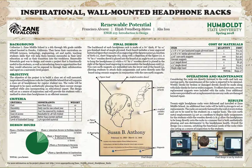 For the past few years Cal Poly Humboldt's Engineering 215 - Intro to Design class has partnered with Zane Middle school in Eureka, CA to create projects on the Zane campus that benefits the school community. Renewable Potential was tasked with the creation of inspirational headphone racks that are to be mounted on the walls of the social studies/digital media classroom. These headphone racks will replace the current headphone storage method which is a dilapidated cardboard box that both damages the headphones and is an eye sore in the classroom. The upgrade to the headphone racks will create a much more appealing classroom environment as well as educating and inspiring the middle school students.