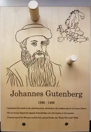Due the limited space available behind some of the computer stations, two different sized boards were needed. 24 of the racks are 8" x 12" x 3/4", these ones are used for the majority of the classroom where there is space to place them behind the station in the location on the wall that allows easiest access for the students. The other 8 racks are a smaller size because of the limited amount of space behind the station. These racks have the Name of the figure across the top of the board instead of under the figure like the larger sized rack. Their lifespan date is under the birthplace map instead of under the name like in the larger rack. Other than those changes the rest of the text is in the same location.