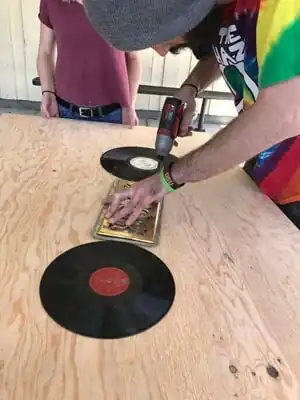 Plan out design of violin for side panels. Team Strange used old records, bottle caps, brass air vents, license plates, and recycled wood to create the violin.