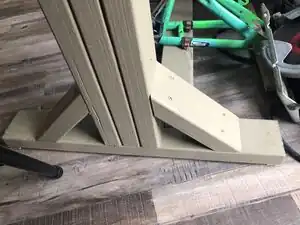 Our final design features an adjustable table with a pedal system. The desk has two main legs attached to parallel runner boards on the bottom, giving the desk a strong base. The middle board is attached to the bottom of the table top and fits snuggly in between the previously said two main legs. The legs have five preset heights that utilize four nuts and bolts, to hold its position. To adjust the table, two wrenches and a rubber mallet will be provided to our client representative to aid in adjusting the nuts and bolts. In addition there are a total of eight 45 degree angle support boards that make the table top and bottom runner boards sturdy. As for the pedal system, it is a recycled bike frame secured to two boards with copper brackets as a base. The pedal system is easily detachable, but sturdy enough to stay in place when in use. As for the table top, it was created with a piece of plywood on the bottom for strength, then another was painted with whiteboard paint and screwed on top. A ¼" piece of trim also runs along the perimeter to keep things from rolling off.