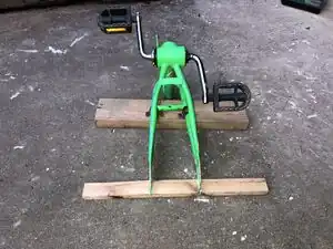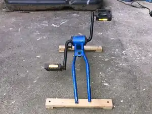 For our first prototype we decided to figure out a way to make a pedal system that would be able to be placed underneath the desk. We found our first donor bike at a local scrap yard in arcata. I took it home for a grand total of $5. The bike was already stripped down but the pedals and frame were intact. When it came to the design of this first prototype, we didn't have anything in particular in mind. We were just going to use ideas we found on the internet and try to modify them to suit our needs. As soon as we made the first cut on the donor bike, we realized that we could have made a different cut that would have been significantly better, but it was too late to go back. In the end, we were able to scrap it together.