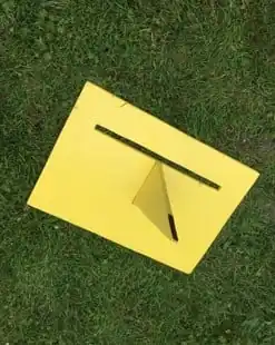 Next, cut out the body support by cutting out a triangle with a 9" base, a 6" height and a hypotenuse fitting of the Pythagorean Theorem. Then, cut out a rectangle measuring 9" long by 4" tall. This is the most difficult piece to fashion as one end of it must be flat for a few inches and then very gradually taper to an unmeasured angle. This angled portion is what the writing surface will rest on. This rectangular piece must also have a 4" long by 1" tall piece cut out of it to prevent it from slipping out of the hole cut into the body.