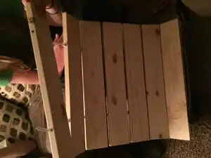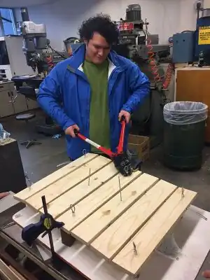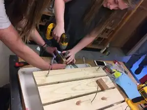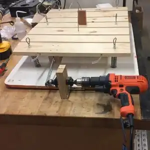 This shake table uses a drill to turn an axle, which translates movement along a metal shaft in order to shake the table top. The top of the table is composed of seven wooden slats, each 21 inches long, three inches wide, that are held together using plastic tubing and epoxy with small compression springs in between each slat. The structures that are built by the students will be held to the top of the shake table using straps that are connected to a few of the slats. The top of the table is supported by a total of eight compression springs that are connected to five of the seven wooden slats, three of the slats will have two springs connected to them, but two of the slats will only have one spring. The compression springs that support the tabletop are held in place by a combination of epoxy, setting the end of the spring into the board one-quarter inch, and also compressing the springs one-quarter inch using a wire clamped with aluminum ferrules.