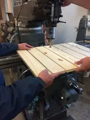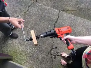 Connect two wood blocks underneath the table top and sandwich the steel bar between them, bolting it in place. Now that everything's connected, plug in the drill and start shaking.