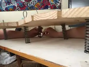 Place springs in pockets of both board. Run wire cable through base board, spring, then the table-top. Crimp the wire using aluminum ferrules, to hold the springs in place in between the boards.