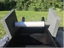 The wheeled component in this project consists of two square wheels and an axle. The wheels are 8- inches on each side (as requested by the client), and the thickness is ¾ inches. In the center of these square wheels is a wooden axel with a plastic PVC pipe incasing the axel. This allows the axel to spin freely as the user rolls the wheels along the catenary shaped track. The wheels and axel mechanism are bound together using 3-inch wood screws.