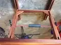 Final assembly can now be started by attaching the 4 remaining members of the legs onto the bottom of the desk. Make sure to attach the members of the legs running a 3" carriage bolt through the single hole at the top of the legs onto the the hole at the bottom of the desk top.