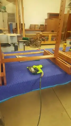 Place a single piece of the legs into the base making sure it is directly aligned in the center. Using the nail gun attach the piece and then proceed to run wood screws through it so that it does not move under load. Repeat steps 8-9 to create the second part of the base