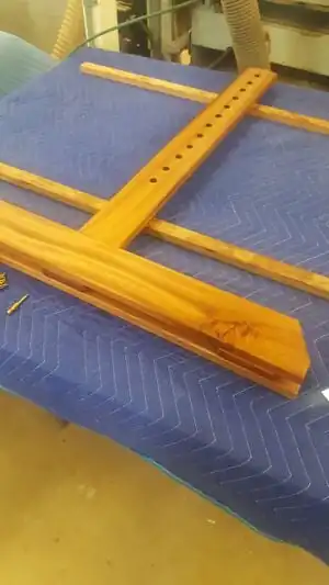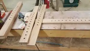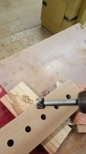 Using a ⅝" forstner bit, drill 6 holes 2 inches apart from each other on every piece of the legs starting from the bottom. Drill a single hole into every member on the opposite side of the previously drilled holes.