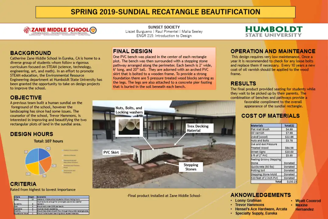 Catherine Zane Middle School in Eureka, CA is home to a diverse group of students whom follow a rigorous curriculum focused on STEAM (science, technology, engineering, art, and math). In an effort to promote STEAM education, the Environmental Resource Engineering department at Cal Poly Humboldt has been granted the opportunity to take on design projects to improve the school. A previous team built a human sundial on the foreground of the school, however the landscaping has since had some issues and an employee at the school, Trevor Hammons, is interested in improving and beautifying the sundial square area.