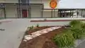 The tessellating concrete paths at Zane Middle school are placed in solely the rectangular site location. The triangular portion of the groundwork features a pathway of alternating red and white tiles to form a checkered pattern. Spaces have been left around the tiles for the placement of grass seed in order to secure the tiles. Smaller pieces of pavers are located at the edge of either end of the path. Three Cala lilies are contained within the triangular segment.