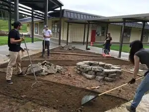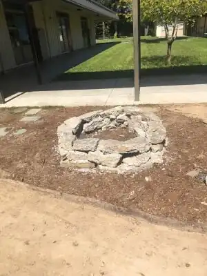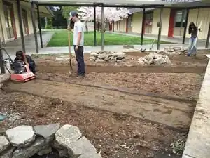 This project was designed by Team Geometrees, HSU students taking ENGR 215 taught by Lonny Grafman in Spring 2019. Catherine Zane Middle School, a STEAM-based charter middle school, was the client. The client representative for Zane was Trevor Hammons, a school admin. Trevor has worked with Grafman and HSU for several years, and had a previous HSU student group work in the same area as this project. By the time Team Geometrees saw the project, it had decayed to the point of being unsatisfactory. The previous area had an uneven, star-shaped path made of reused concrete blocks. Additionally, there was only wood chips in the triangle surrounding the path.