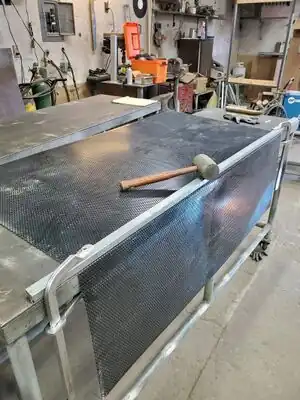 Using a soft rubber mallet, mold the perforated metal sheet around the bench frame to add stability and provide a good sturdy base on which to attach the street signs.