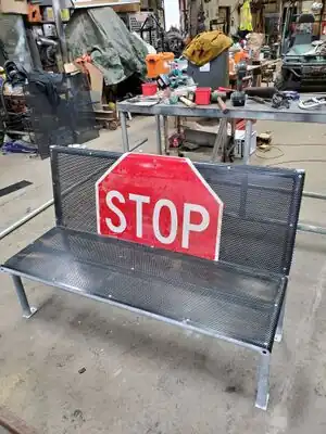 Using a pop rivet gun, attach rivets to hold the perforated metal sheet to the frame. Then, using the same method, attach street signs to the perforated metal sheet. By using rivets rather than screws that could protrude from the bench and pose a safety hazard due to their sharpness, the chance of injury resulting from using the bench is eliminated.