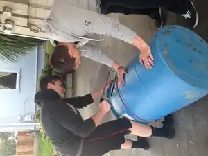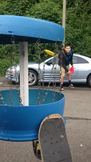 After speaking with Trevor Hammons, a counselor at Zane Middle School, we (Desiree and Cole) discovered that this disc golf basket is not currently in use at the school. Trevor explained that the ultimate goal of the project was to be able to have a disc golf course across the campus, which was not really possible with the single basket. According to Trevor, the basket was also "not as portable as it could be" due to the skateboard decks. A suggestion to anyone interested in constructing this or something similar would be to build more than one so you can have a whole course to play. The disc golf caddy is shown below in its compacted form to the right and its upright form to the left.