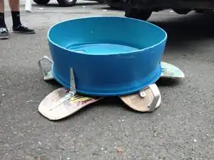 The Base: The base is designed to support the weight of the basket without falling or wobbling. Our base consists of 3 standard skateboard decks affixed to the bottom of the basket using hinges. The hinges are attached every 25½" of the circumference. This tripod design provides sturdy support, and also allows the skateboard decks to fold up against the bottom of the basket.