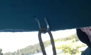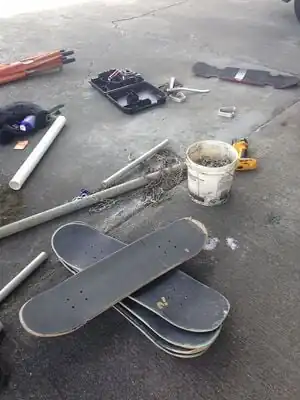 Measure and mark 323.5" segments around the circumference of the bottom of the basket. There should be 3 equally spaced marks. At each mark, attach a hinge using screws. The hinges should attach to the outside of the barrel and point up. Screw a skateboard deck onto each hinge.