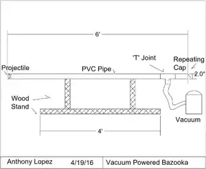 The final project is a fully operational vacuum bazooka. The vacuum bazooka is capable of shooting cylindrical projectiles that fill the volume of the PVC pipe. The cylindrical projectiles must fill the volume of the PVC pipe as this increases the suction force created from the vacuum, which in turn launches the projectile further. In order to make our vacuum we utilize a Shop-Vac 5986000 5-Gallon that has a peak of 4.5 HP. The shop vacuum is attached to a tee connector that is attached to the barrel. The length of our PVC pipe which composes our barrel is 5 ft. The Shop-Vac will be attached to a hose adapter which in turn will be connected to the tee connector. Once the Shop-Vac is turned on, a vacuum will be created by the Shop-Vac (from the pump within the Shop-Vac) which will create a suction force emanating from the tee connector. Once a cylindrical projectile is put in from the back of the vacuum bazooka, the suction force will propel the projectile towards the front of the vacuum bazooka and it will launch out.