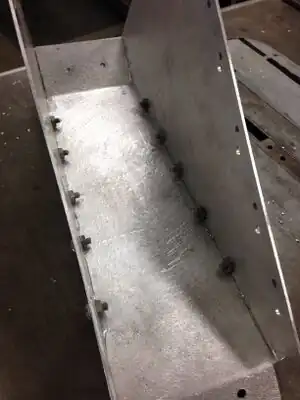 Two attachments were designed for each side of the downspout in order to create a more gradual path for the water and debris to travel through. The AutoCAD drawing in Figure 3 shows a schematic of the proposed design. The bottom portion of the horizontal component of the gutter was cut eight inches on each side of the downspout, which is up to the cut-off end on the front side, and the connected vertical components were cut off 11 inches down on the front side. The attachments consist of two eight by 11 inch 90 degree triangles and a rectangle to connect them by their hypotenuses. One inch flaps are attached to each side of the rectangle so that it is able to be attached to the current system as well as the triangles, and one inch flaps are also connected to the other two sides of the triangles which are used to connect to the current system. A small rectangle bracket is also used to cover the previously cut-off end of the gutter which is connected by using one inch flaps on each side as well. Finally, sealant is applied at every connecting area in order to prevent any leaks. Only the front part of the design was approved by maintenance, which can be seen in Figure 4 and is discussed more thoroughly in the Discussion and Next Steps section.