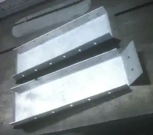 Cut rectangular pieces that will be used along the hypotenuse of the triangular pieces. Bend at a 90 degree angle along the length of the pieces. At the top of the front piece, bend to the correct angle to match the angle of the triangular pieces. At the bottom, bend the metal piece to be flush with the current gutter. See photo.