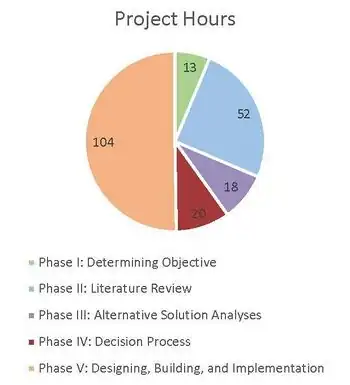 The costs throughout the project are categorized into Materials Costs and Design Costs. Materials Costs include the price of all materials used in building the design and can be seen in the table below. Design Costs are the total hours spent on the project split up by project section, and are displayed in the pie chart in Figure 4.