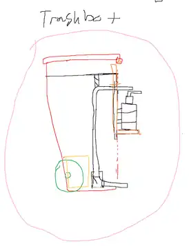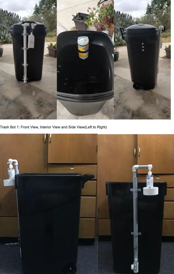 Both Trash Bots primarily consist of, a trigger mechanism, hand sanitizer reservoir, and a trash can.